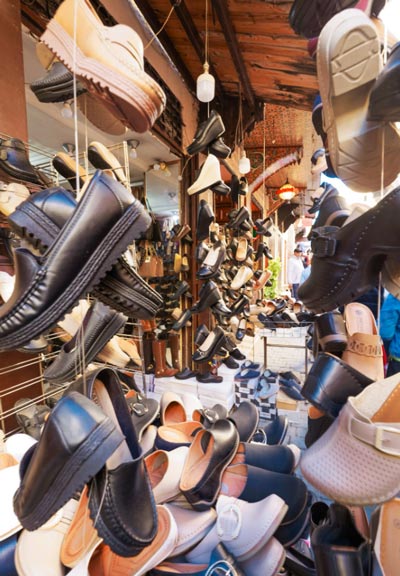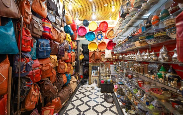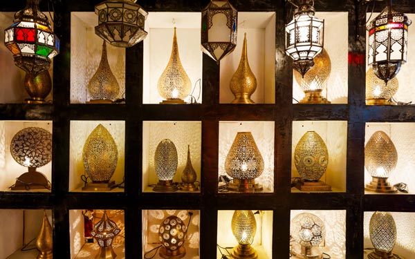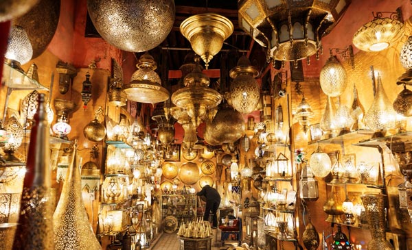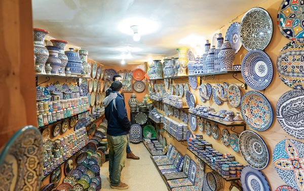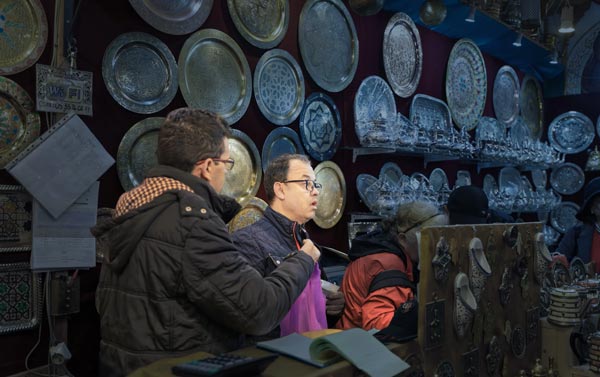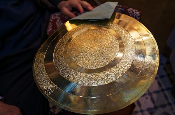 Almost every one of these narrow streets is lined with a variety of shops. Besides restaurants, butchers, and grocers, most sell handicrafts, including copperware, silverware, lamps, pottery, and carpets. All are handmade using ancient methods. The clanking sounds of hammering and the silent demeanor of the artisans create a unique landscape in Fez.
