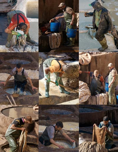 Workers stand on the edge of the vibrantly colored dye vats, some inside or walking among them. Some dye leather, others wield knives to trim fur, some add water and other ingredients to the vats, and some carry plastic buckets filled with dye (manure) and tread briskly along the 10-centimeter-wide stone vats...