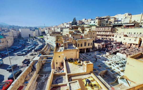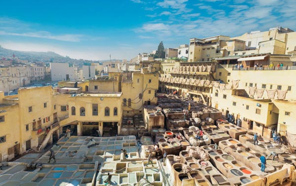 Chaouwara Tanneries, a massive leather dyeing workshop near Place as-Seffarine in the old city, dates back to the 18th century. Their natural leather processing methods are said to have been preserved for over a thousand years. Hundreds of honeycomb-like stone vats are neatly arranged between bright yellow buildings, and workers with clearly defined roles bustle about at their respective stations.